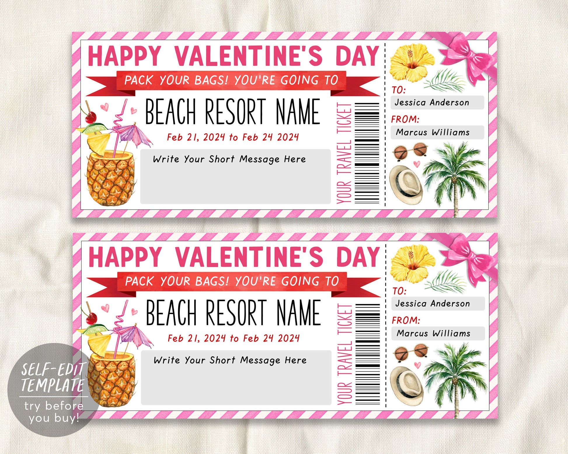 Beach Resort Vacation Travel Ticket Editable Template, Valentines